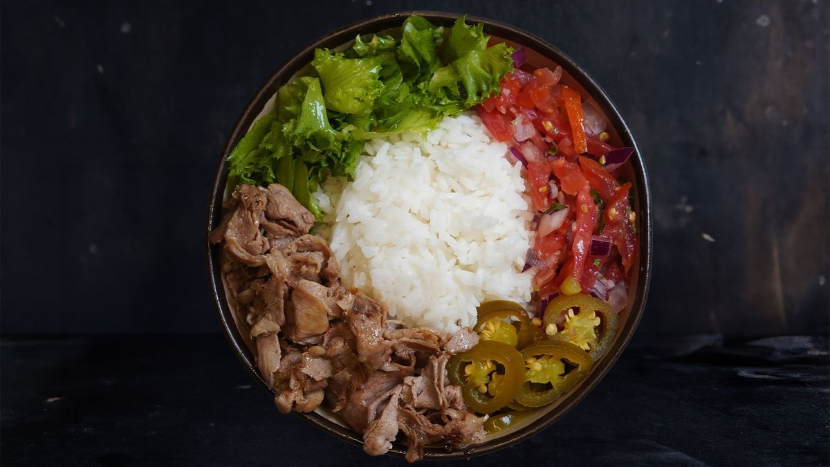 קערת אורז, חסה, פיקו דה גאיו וחלפיניו בתוספת חזה עוף