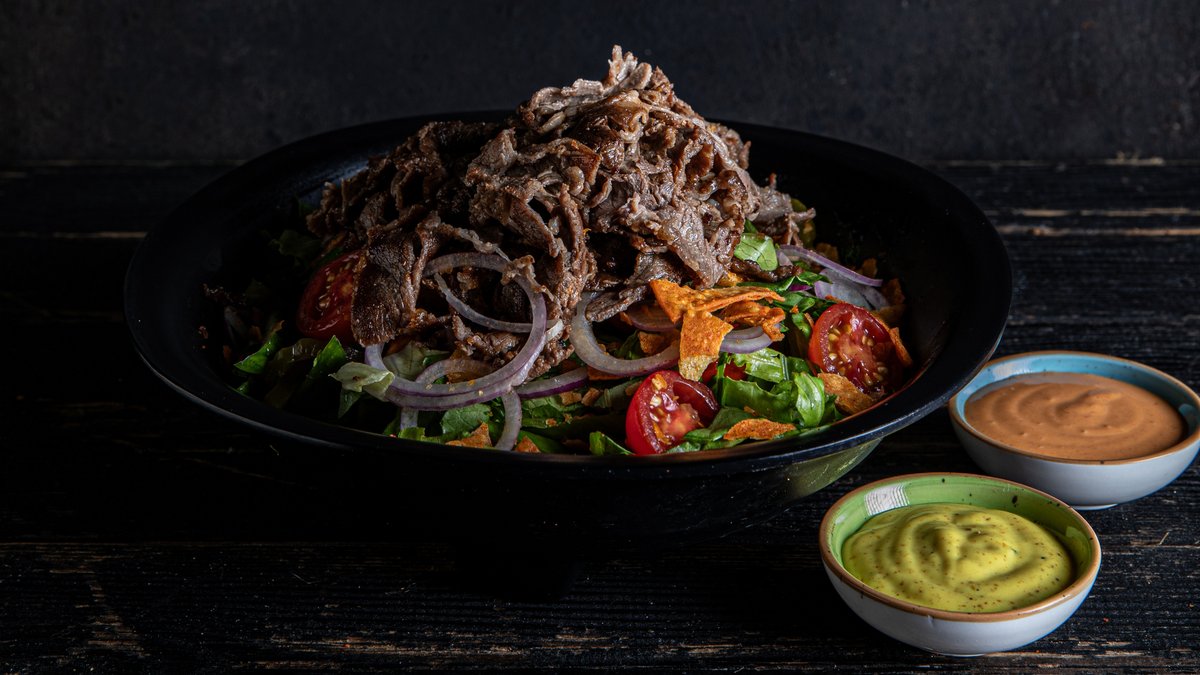 אנטריקוט, חסה, מלפפון, שרי, בצל סגול, מלפפון חמוץ ושברי נאצ'וס, ברוטב איולי שום, קארי וצ׳יפוטלה