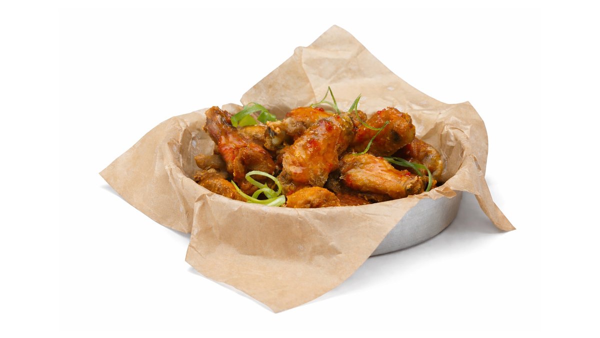 כנפיים בציפוי פריך ברוטב צ'ילי מתוק וקישוט של בצל ירוק ושומשום הרוטב מוגש בצד.