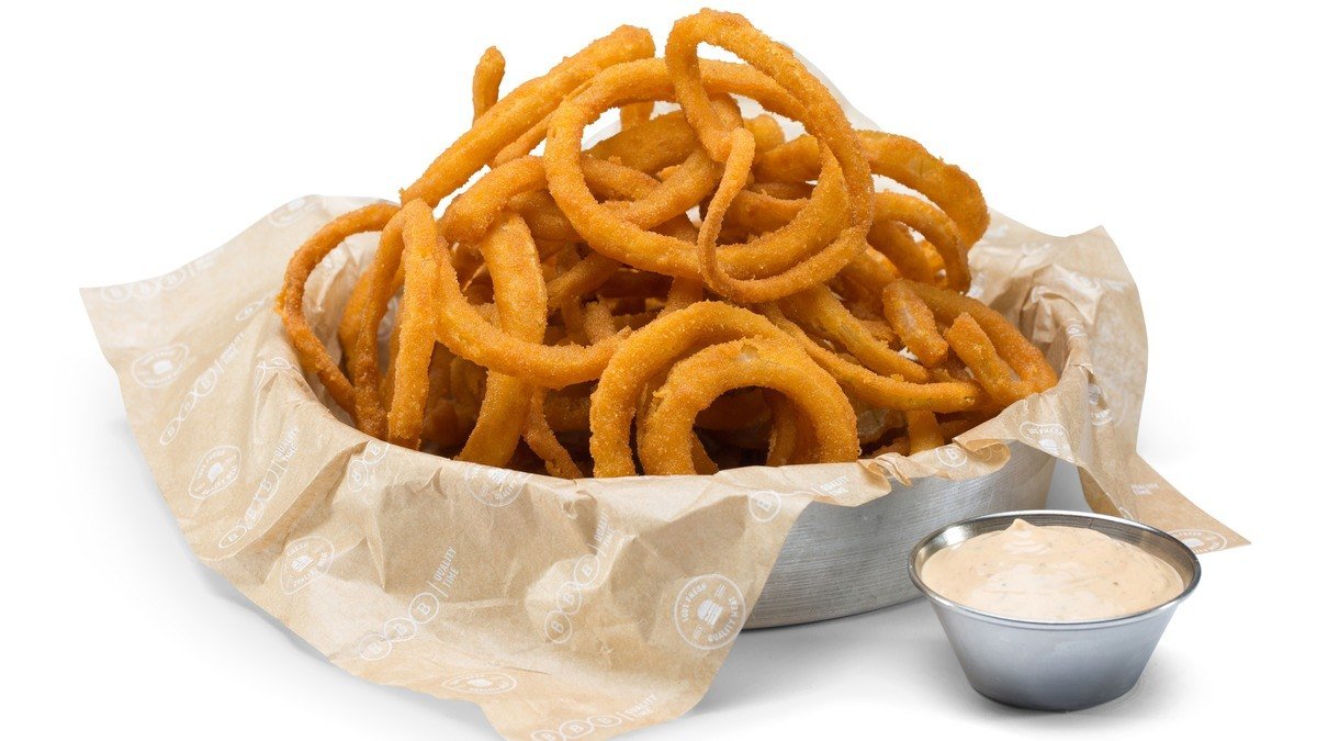 טבעות בצל טרי בציפוי פריך. מוגש לצד רוטב איולי צ'יפוטלה, איולי כמהין ואיולי סרירצ'ה.