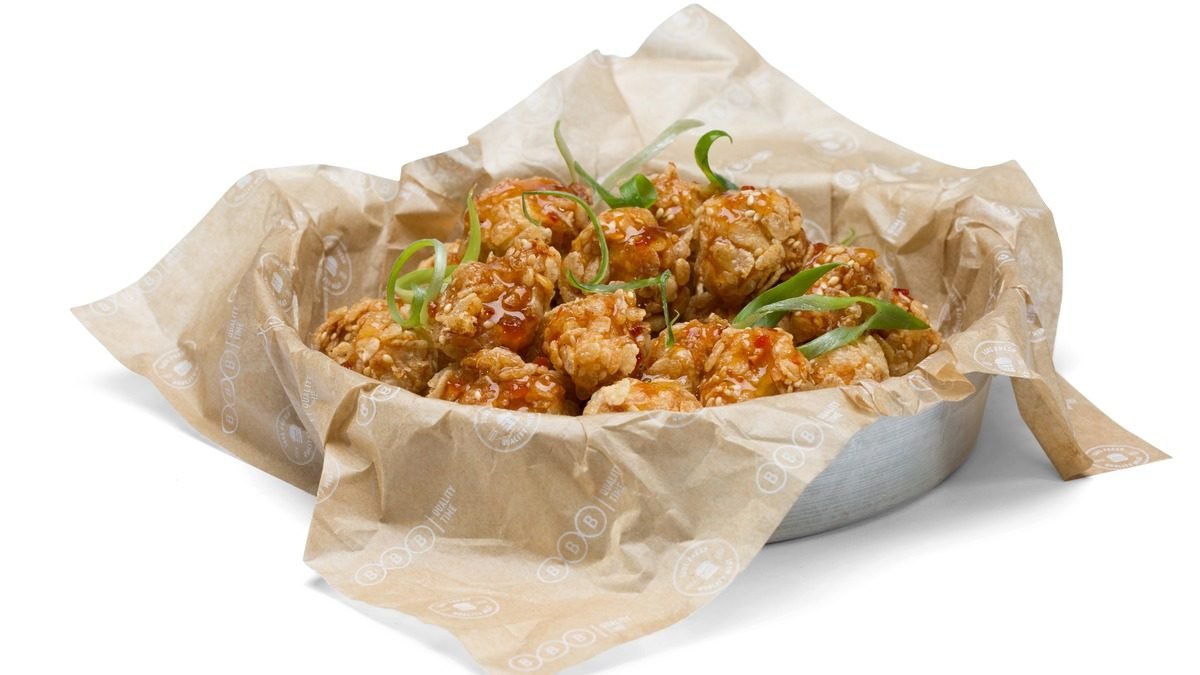 כנפיים בציפוי פריך ברוטב צ'ילי מתוק וקישוט של בצל ירוק ושומשום
