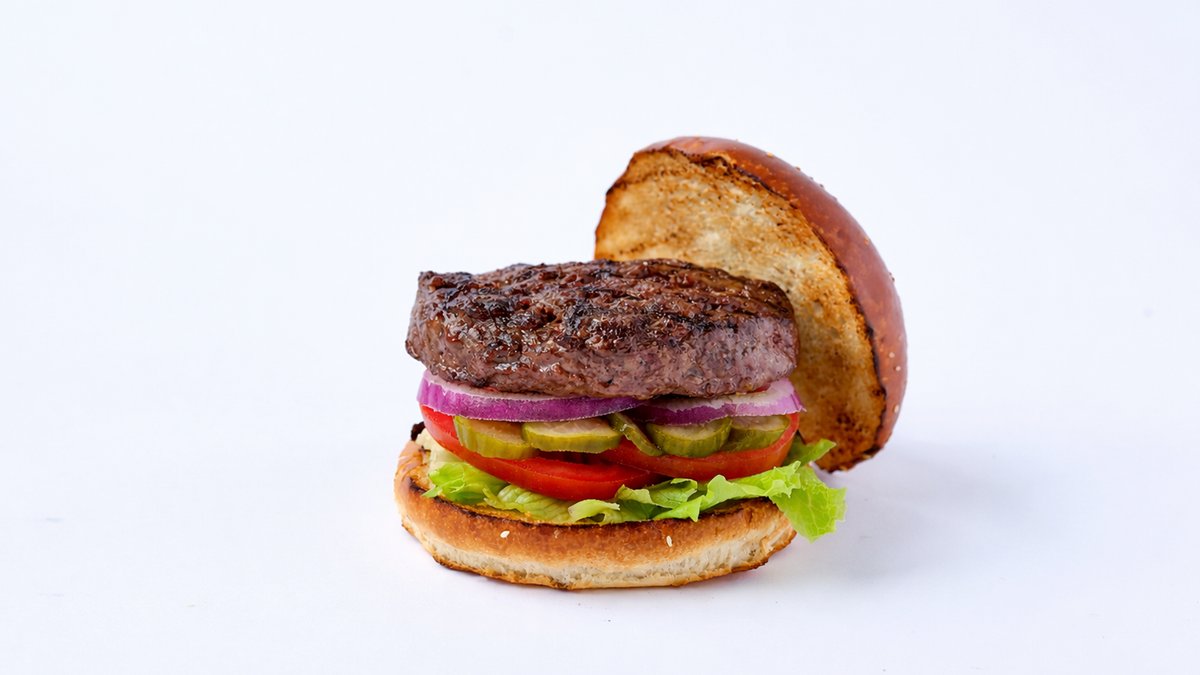 המבורגר במשקל 220 גרם (לפני צלייה) מנתחי טלה ובקר מובחרים מוגש בלחמניה עם חסה אייסברג, עגבניה, בצל סגול ופרוסות מלפפון כבוש