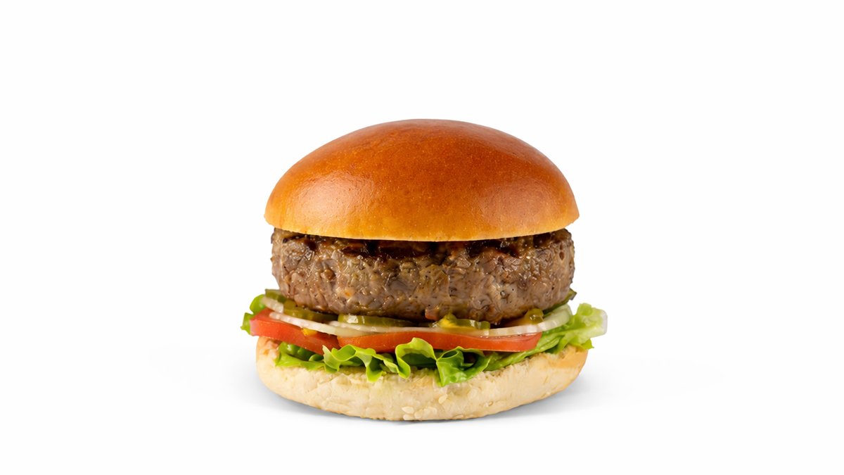 המבורגר על בסיס חלבון אפונה מוגש בלחמניה עם חסה אייסברג, עגבניה, בצל סגול ופרוסות מלפפון כבוש *נעשה על גריל בשרי*