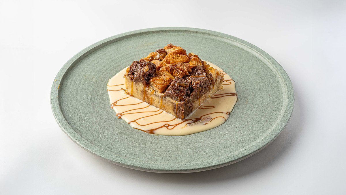 קרעי קרואסון חמאה ובראוניז שוקולד עשיר, טבולים בקרם ברולה צרפתי, רוטב אנגלז ורוטב קרמל מלוח מומלץ לחמם לכמה שניות לפני ההגשה.