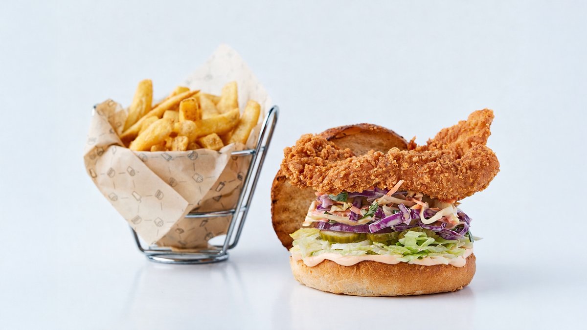 עוף בציפוי פריך, מוגש בלחמנייה עם קולסלאו איולי צ'ילי מתוק , חסה אייסברג, מלפפון כבוש, בצל סגול ואיולי צ'יפוטלה