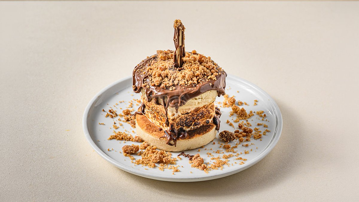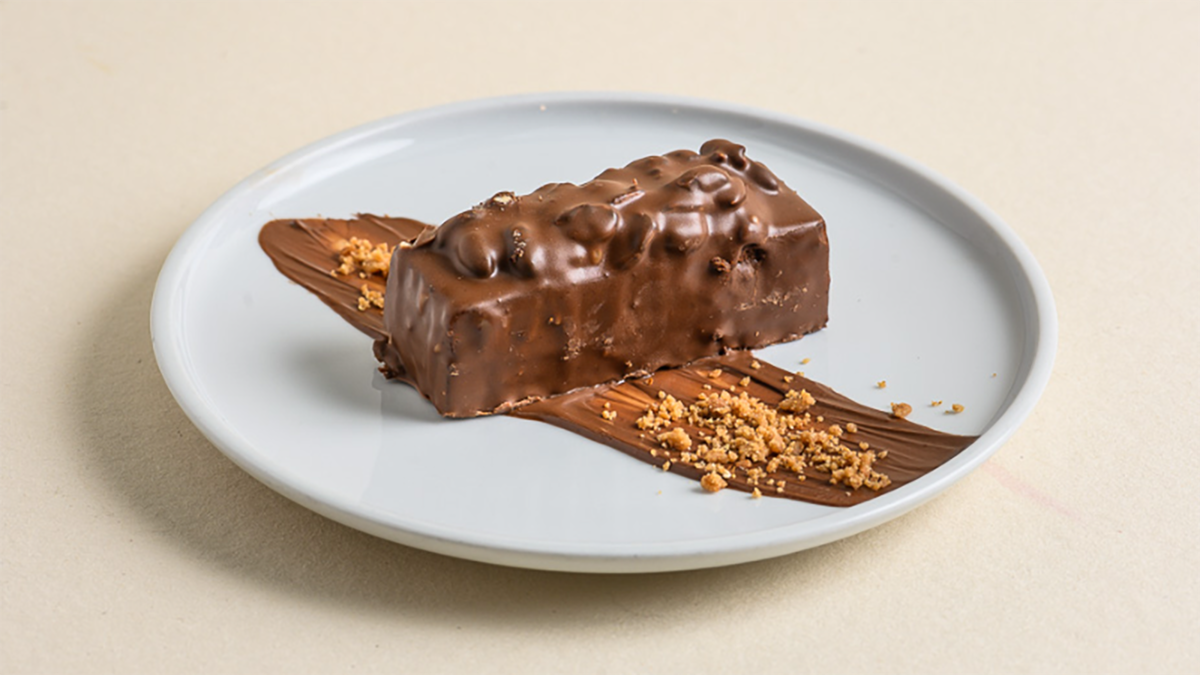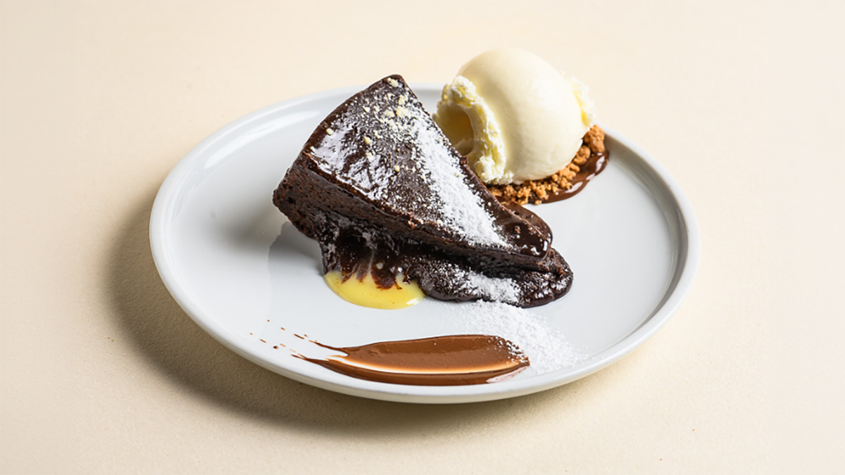 מוגש עם שוקולד לבן, שוקולד אגוזים, כדור גלידה פירורי, עוגיית גרנולה שוקולד צ'יפס.