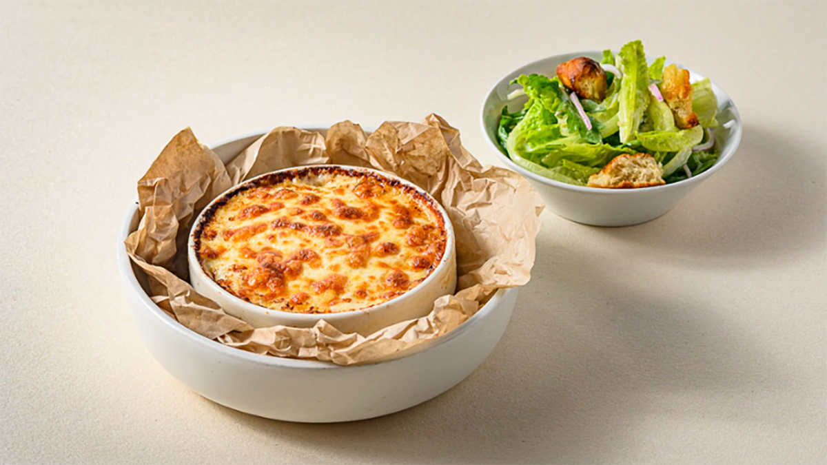 שכבות דקיקות של תפו"א, שמנת ,אגוז מוסקט, קממבר, פרמזן ומוצרלה. מותך בתנור אבן. מוגש עם סלט קיסר אישי