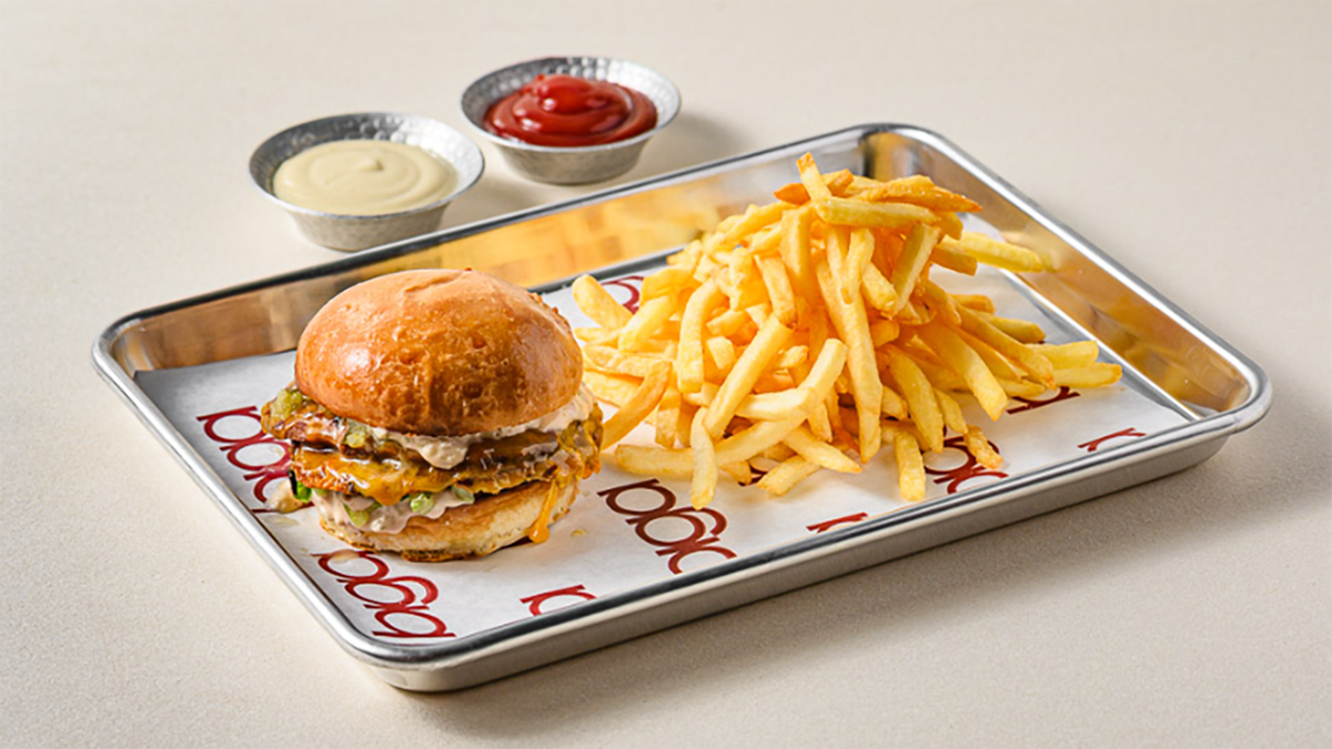 דאבל סמאש בורגר, מוגש בלחמנית המבורגר עם איולי אמריקאי וגבינת צד'ר מותכת, רליש חמוץ מתוק, מלפפון חמוץ, בצל וחסה | מוגש עם צ'יפס אמריקאי בגרסא הטבעונית המנה מגיעה ללא גבינה וללא איולי