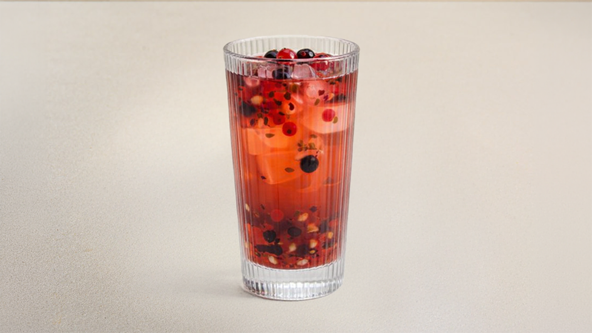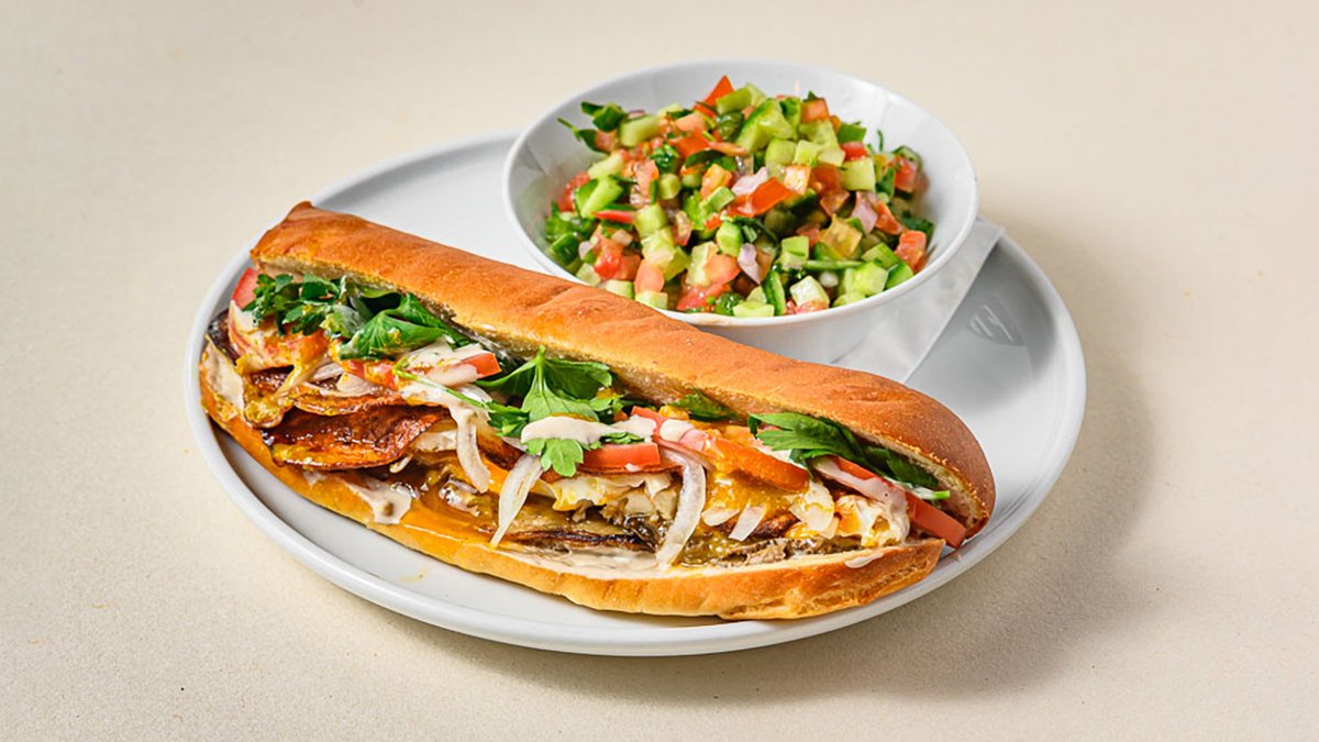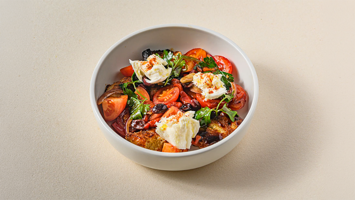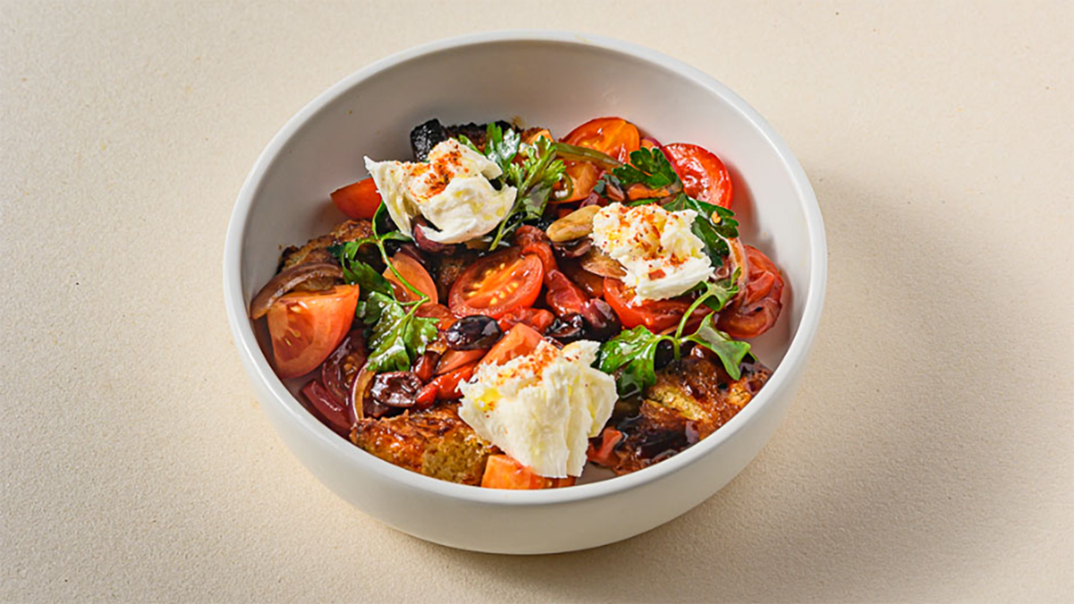 עגבניות שרי; פלפל חריף, שאטה גרוס, בצל סגול, פלפל קלוי, זיתי קלמטה, שום טרי, פטרוזיליה, קרוטוני לחם, גבינת טבעונית בסגנון פטה, שמן זית ובלסמי .