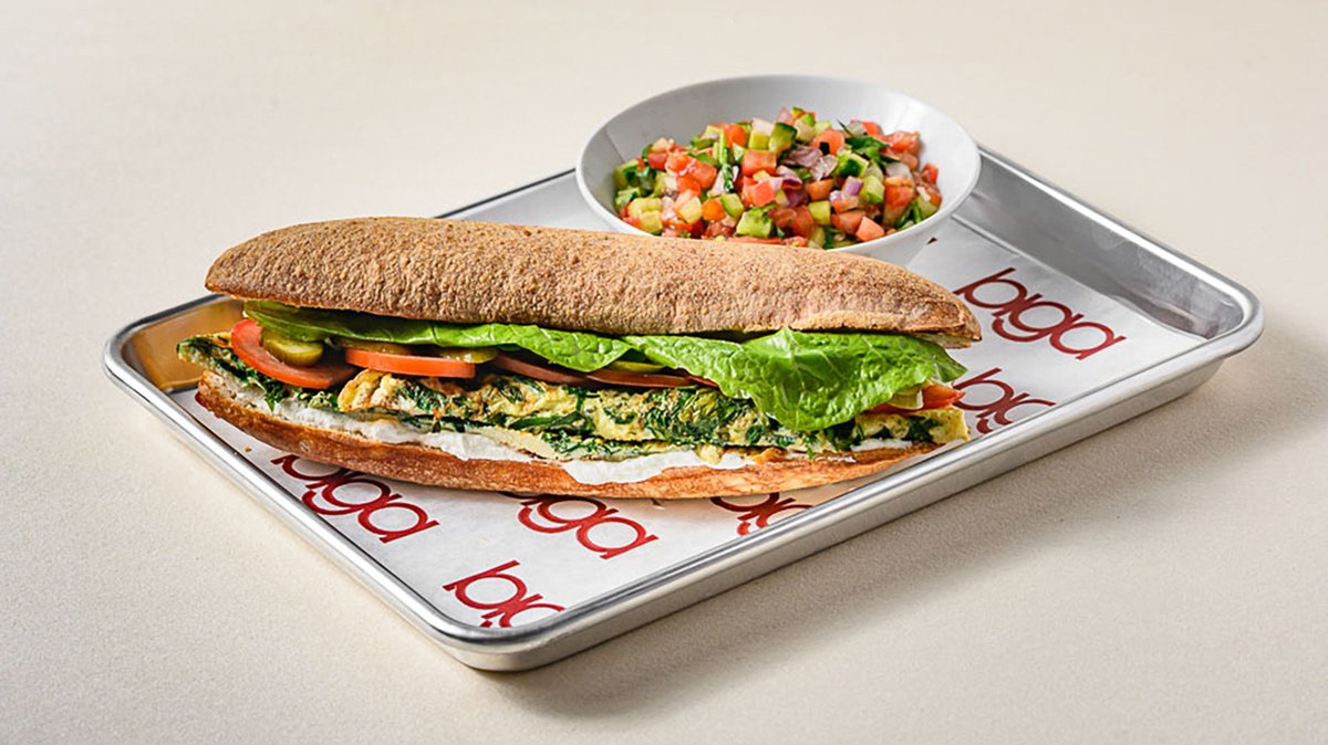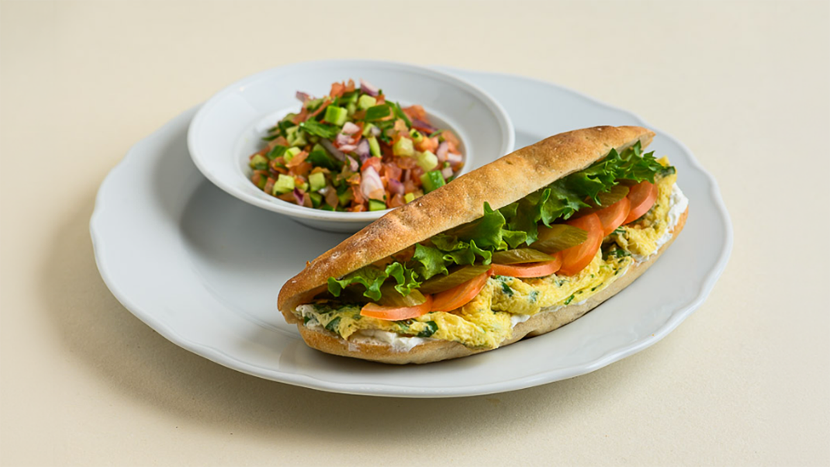 חביתת עשבי תיבול, בצל ירוק ותרד קצוץ, גבינת שמנת, עגבנייה, מלפפון חמוץ וחסה פריכה.