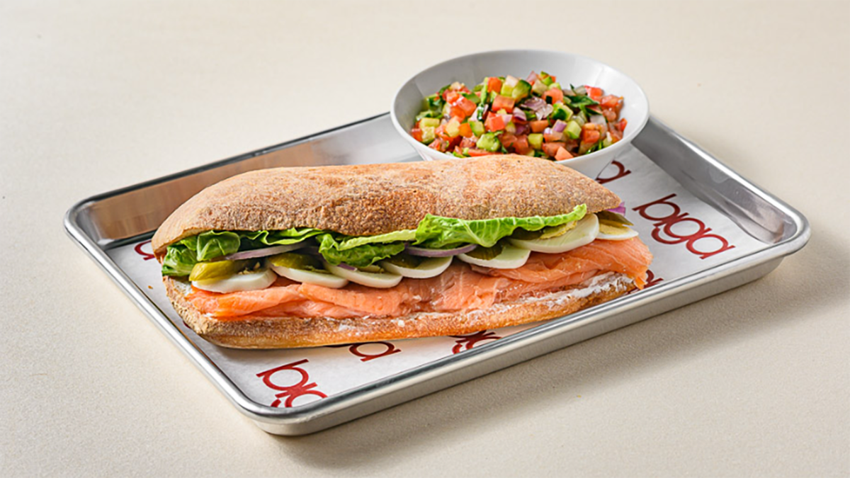 גבינת שמנת, סלמון מעושן ,עגבנייה ,ביצה קשה, בצל סגול וחסה פריכה.