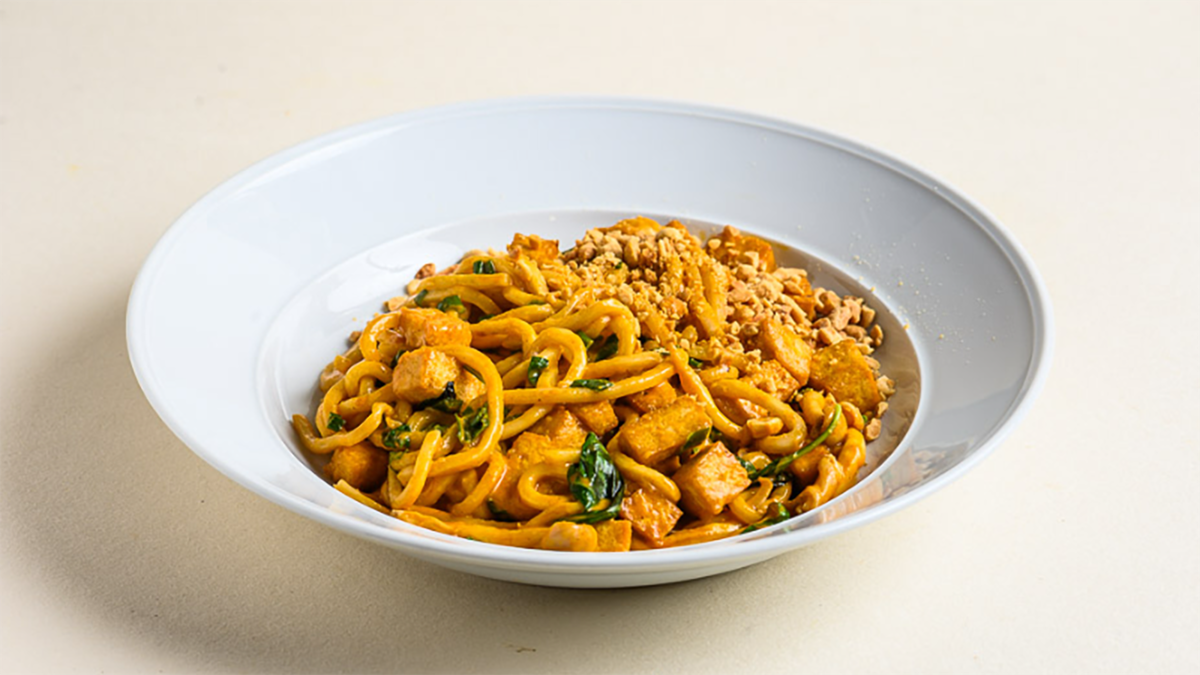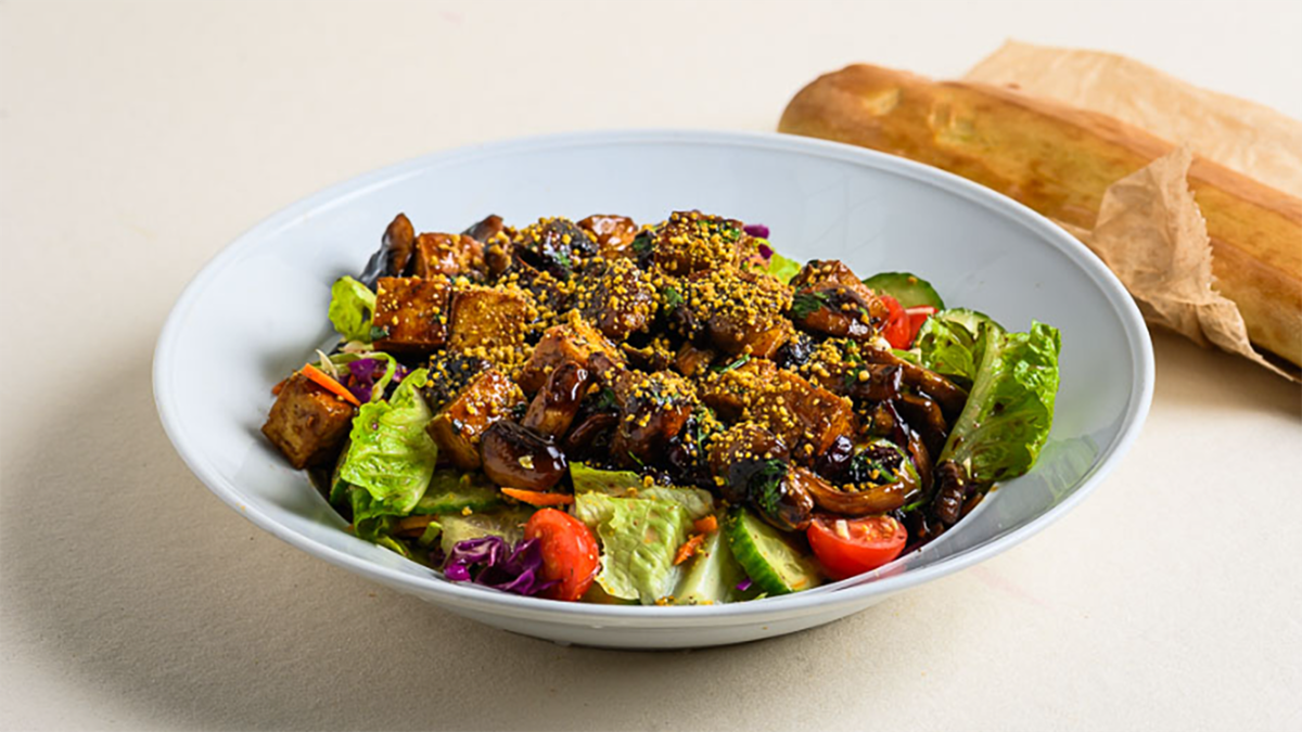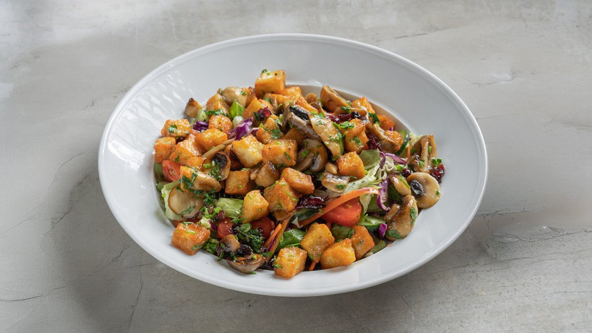 קוביות טופו, חמוציות, פטריות ועשבי תיבול, ברוטב טריאקי, על תערובת חסה עם גזר, כרוב, מלפפון ועגבניות שרי, בתיבול ויניגרט עם קראנץ' תרד.