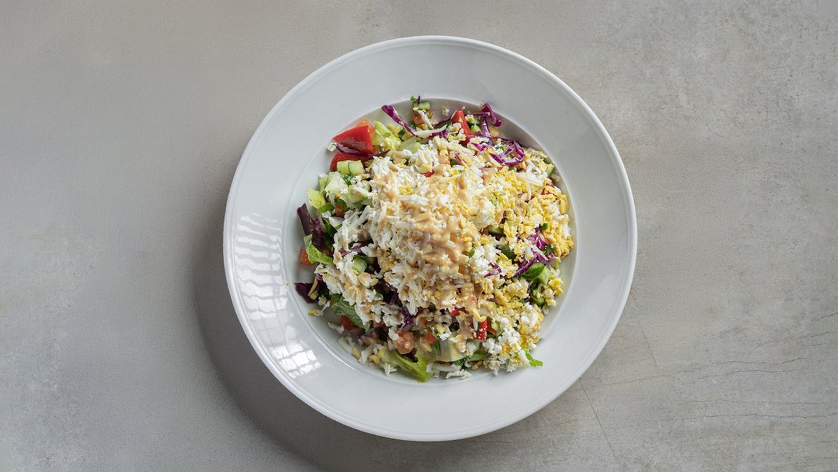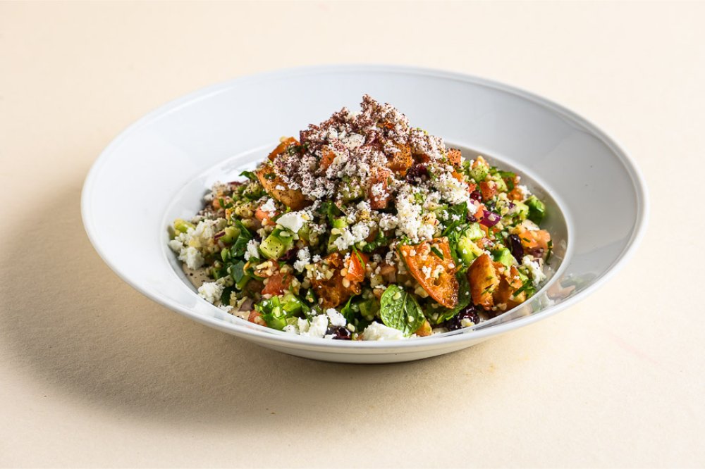 עגבנייה, מלפפון, בצל סגול, שומר, פלפלים, כרוב סגול, חסה פריכה, בצל ירוק ופטרוזיליה, מוגש עם ביצה קשה מגורדת, פטה מגורדת וטחינה גולמית. מוגש עם לחם ללא גלוטן.