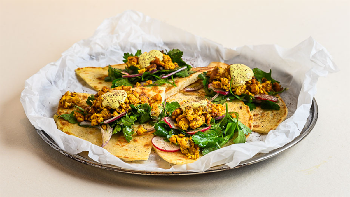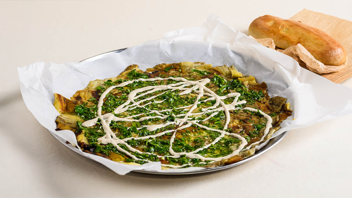 חביתה טבעונית עם בצל, פטרוזיליה ופטריות, גבינה טבעונית בסגנון פטה, עגבנייה, מלפפון חמוץ וחסה פריכה