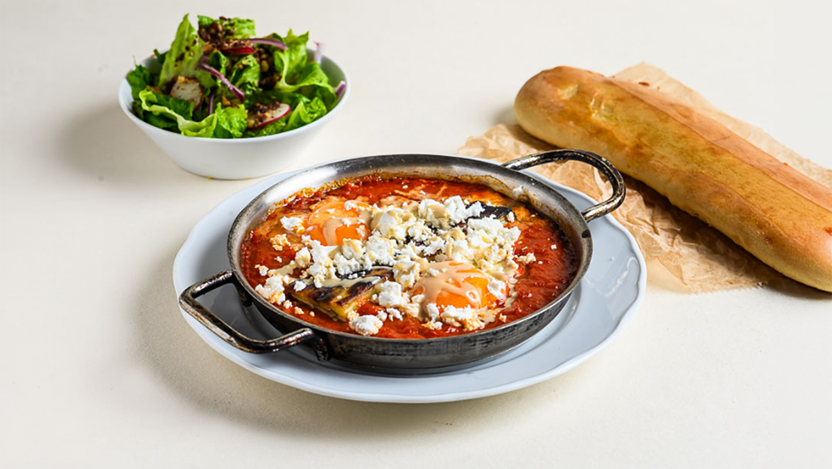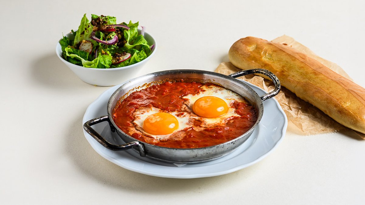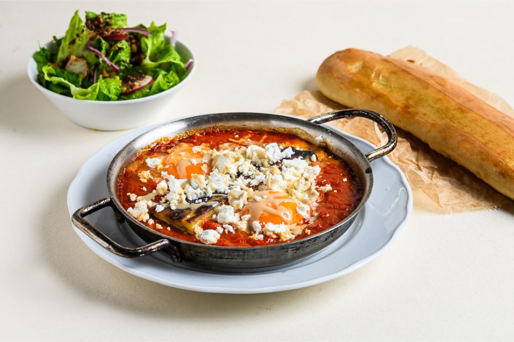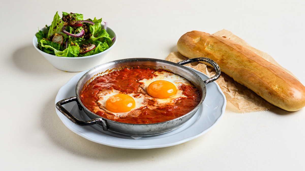 תבשיל עגבניות ופלפלים פיקנטי, מוגש עם שתי ביצים, חציל קלוי, גבינת פטה וטחינה גולמית מוגש עם סלט אישי ופוקאצ'ה