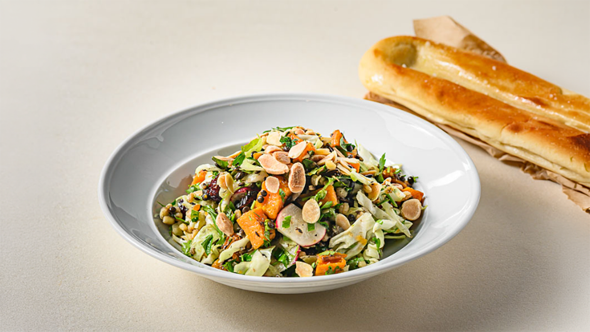 כרוב לבן, קוביות בטטה אפויות, צנוניות, חמוציות, אורז בר, עדשים שחורות, חיטה ,בזיליקום, פטרוזיליה, שמן זית, מיץ לימון, שמן שומשום, סילאן ושקדים קלויים. מוגש עם לחם הבית