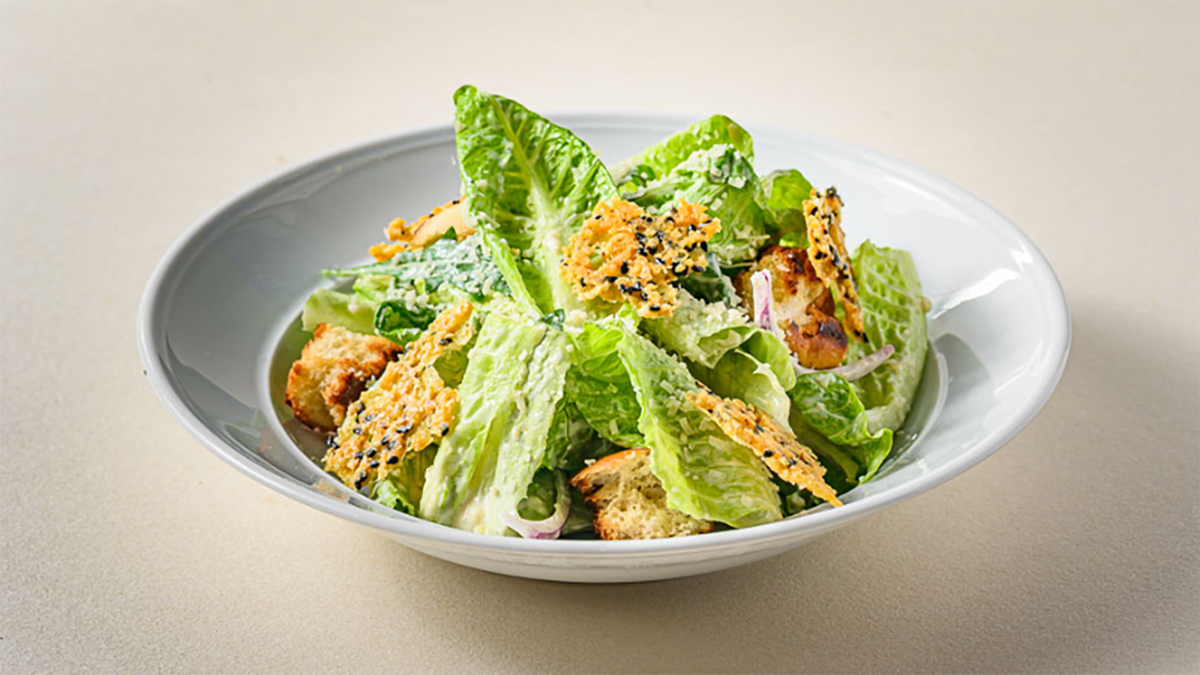 לבבות חסה, קרוטונים מלחם ללא גלוטן, בצל סגול, עגבניות שרי, רוטב קיסר וטוויל פרמזן.