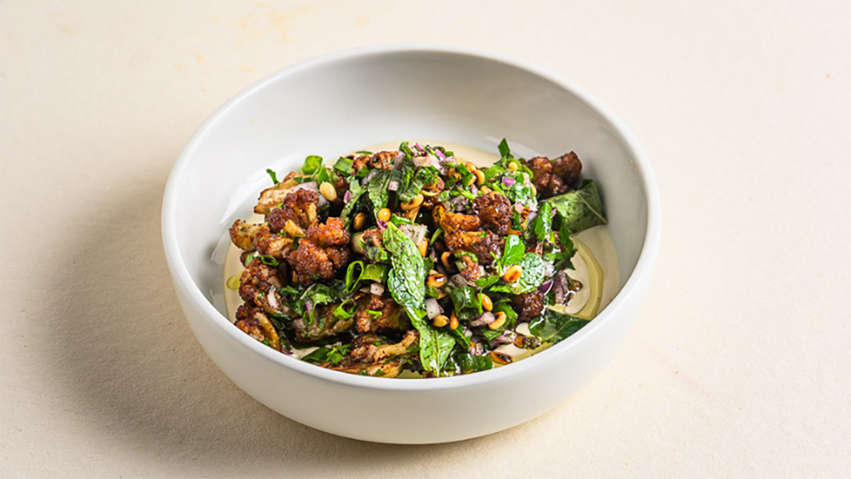 טחינה לבנה, כרובית מטוגנת, פטרוזיליה, נענע, בצל ירוק, בצל סגול, צנובר קלוי, סומק, שמן זית ולימון