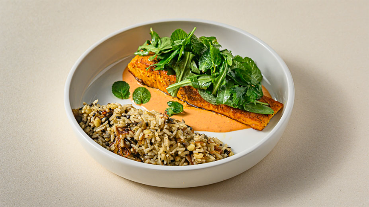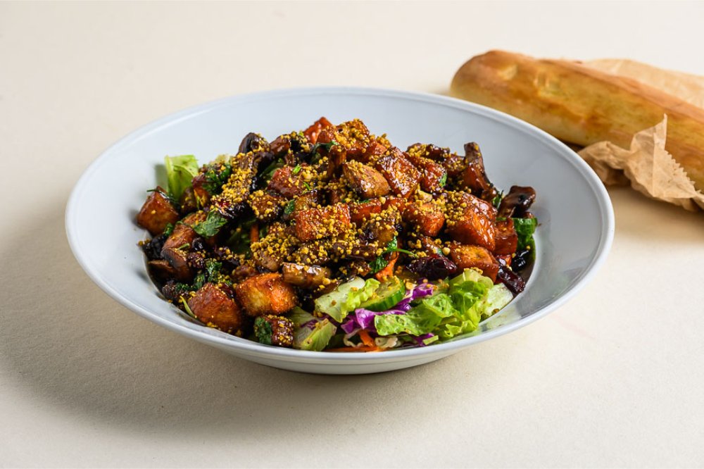 קוביות חלומי, חמוציות, פטריות ועשבי תיבול, ברוטב טריאקי, על תערובת חסה עם גזר, כרוב, מלפפון ועגבניות שרי, בתיבול ויניגרט עם קראנץ' תרד