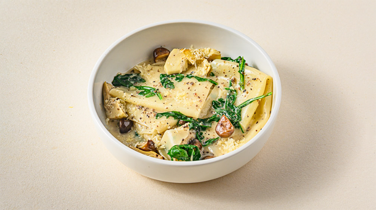 דף פסטה קרוע, חמאה, ערמונים , כמהין, עלי רוקט, ארטישוק ופרמז'ן
