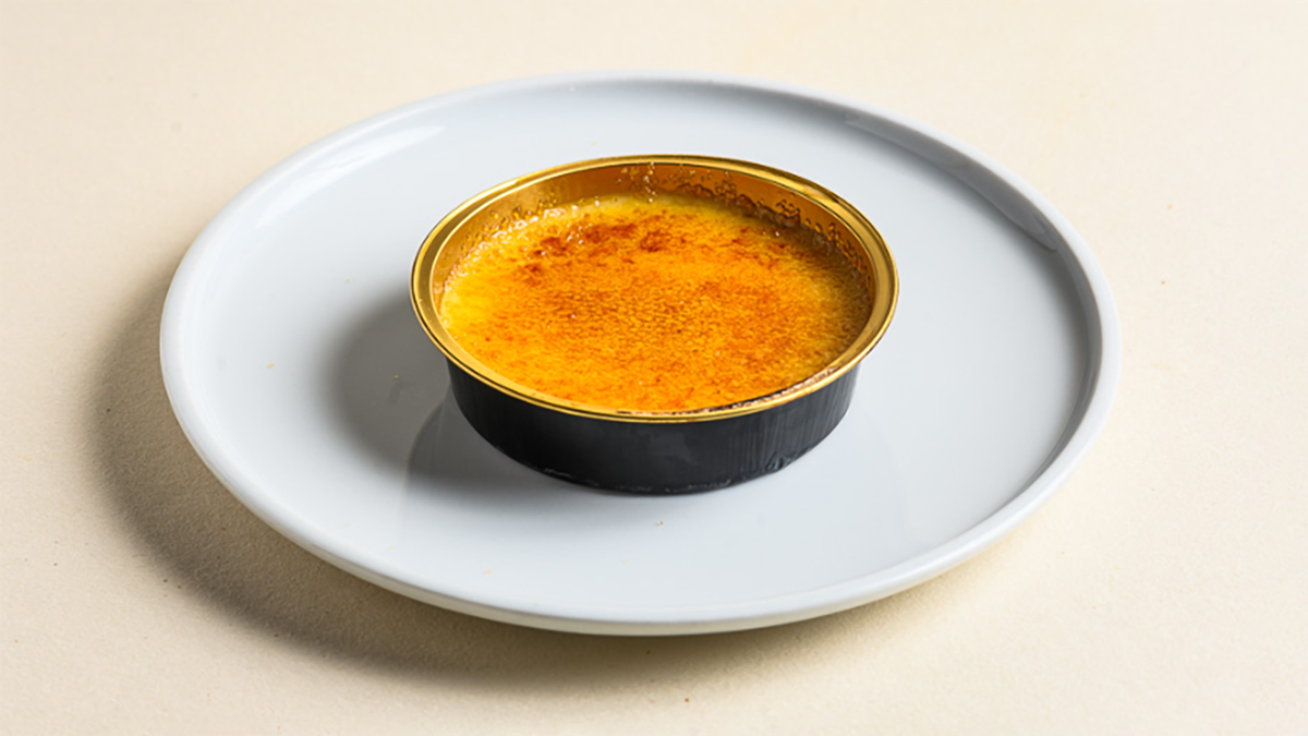 קרם וניל אפוי בתנור, מוגש קר עם שכבת קרמל סוכר חום דקה.