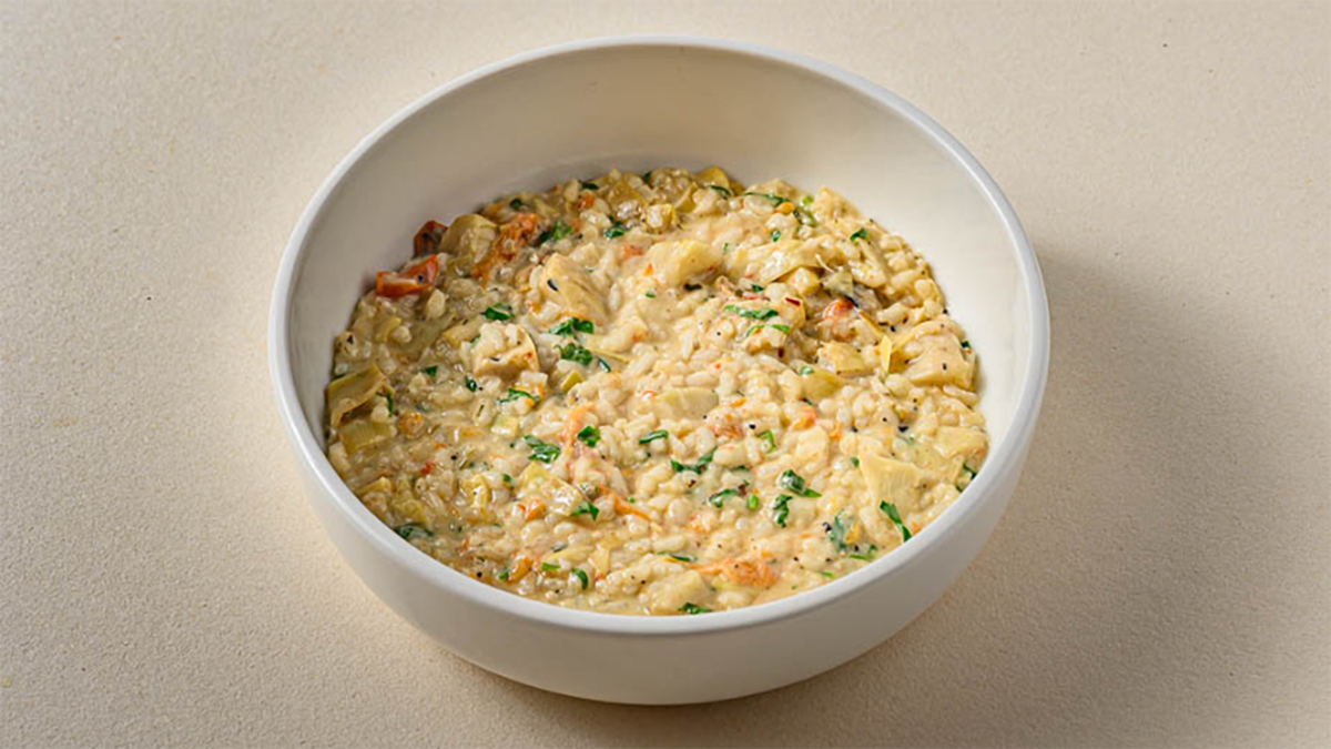 אורז ארבוריו קרמי, חמאה, שמנת, ארטישוק קצוץ, פרמז'ן, פטרוזיליה, שום ועגבניות שרי צלויות.