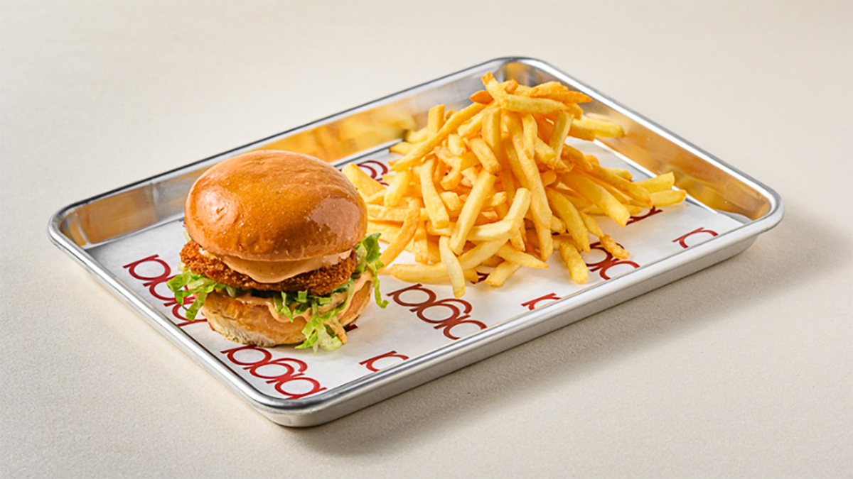 שניצל פריך טבעוני בטעם עוף, מוגש בלחמניית המבורגר, איולי קארי פיקנטי, רליש חמוץ מתוק, מלפפון חמוץ, בצל וחסה | מוגש עם צ'יפס אמריקאי בגרסא הטבעונית המנה מגיעה ללא איולי קארי