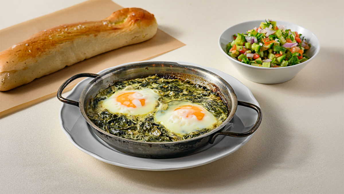 תבשיל שמנת, תרד ומנגולד. מוגש עם שתי ביצים, סלט אישי ופוקאצה