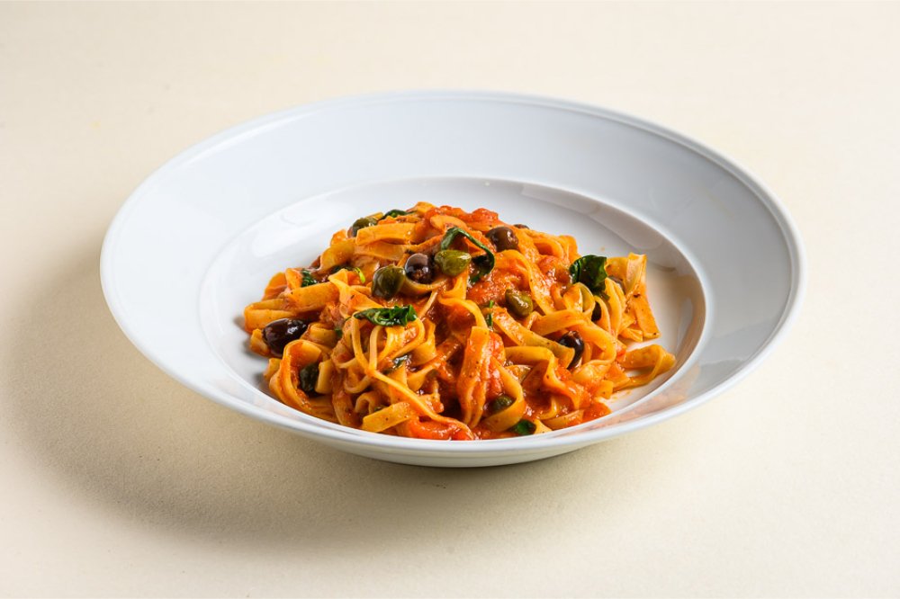 פטוציני, שמן זית, שום פרוס, קוביות עגבניות, זיתי קלמטה, צלפים, רוטב פומודורו ובזיליקום.