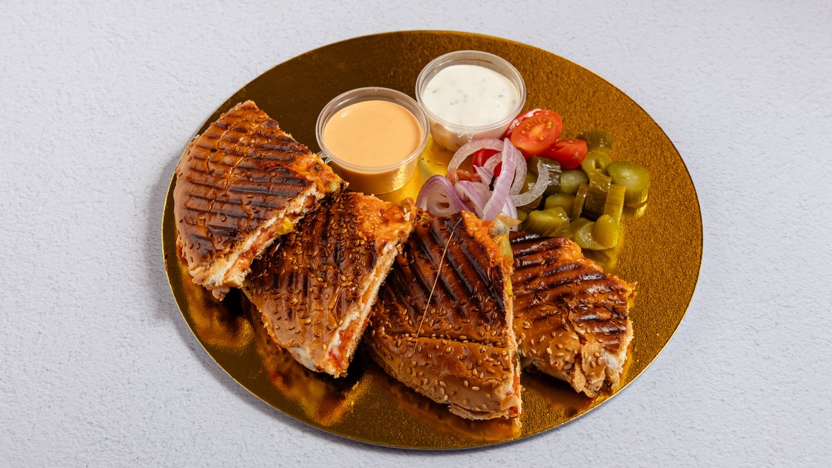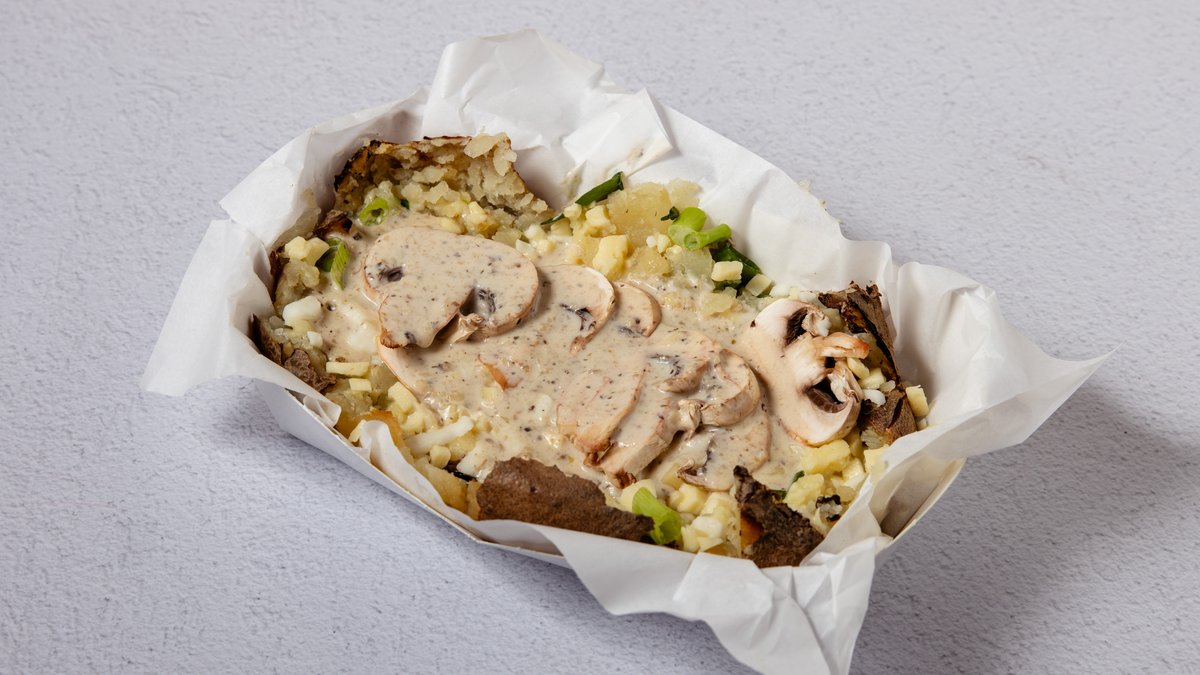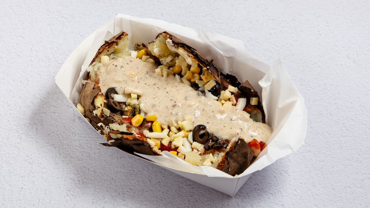 תפו״א אפוי עם חמאה, פסטו, רוטב פיצה, גבינה צהובה, זיתים ותירס ורוטב שמנת מעל