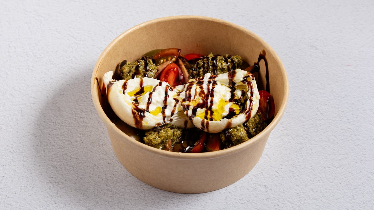 עגבניות שרי, נגיעות פסטו, שמן זית, גרידת לימון וגבינת בוראטה ברוטב בלסמי