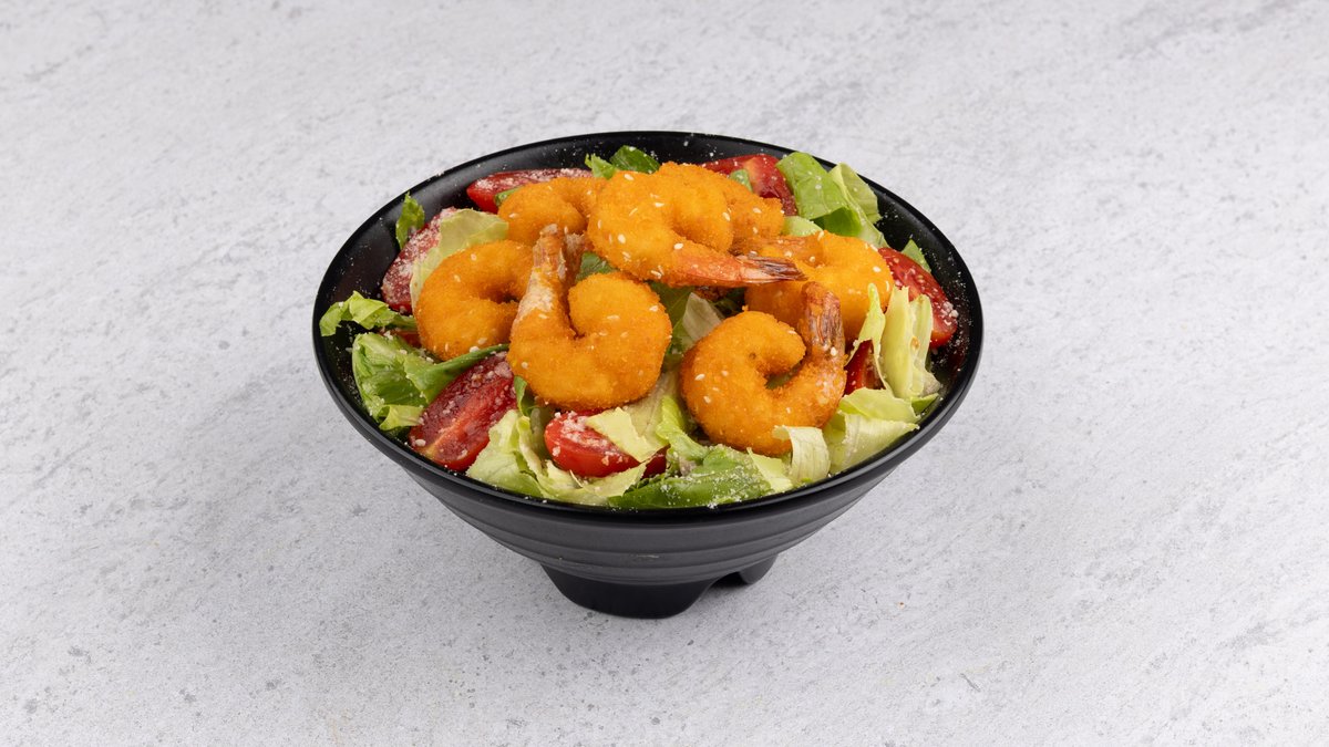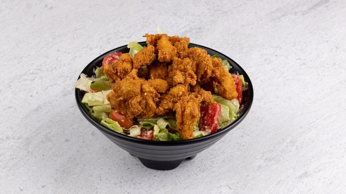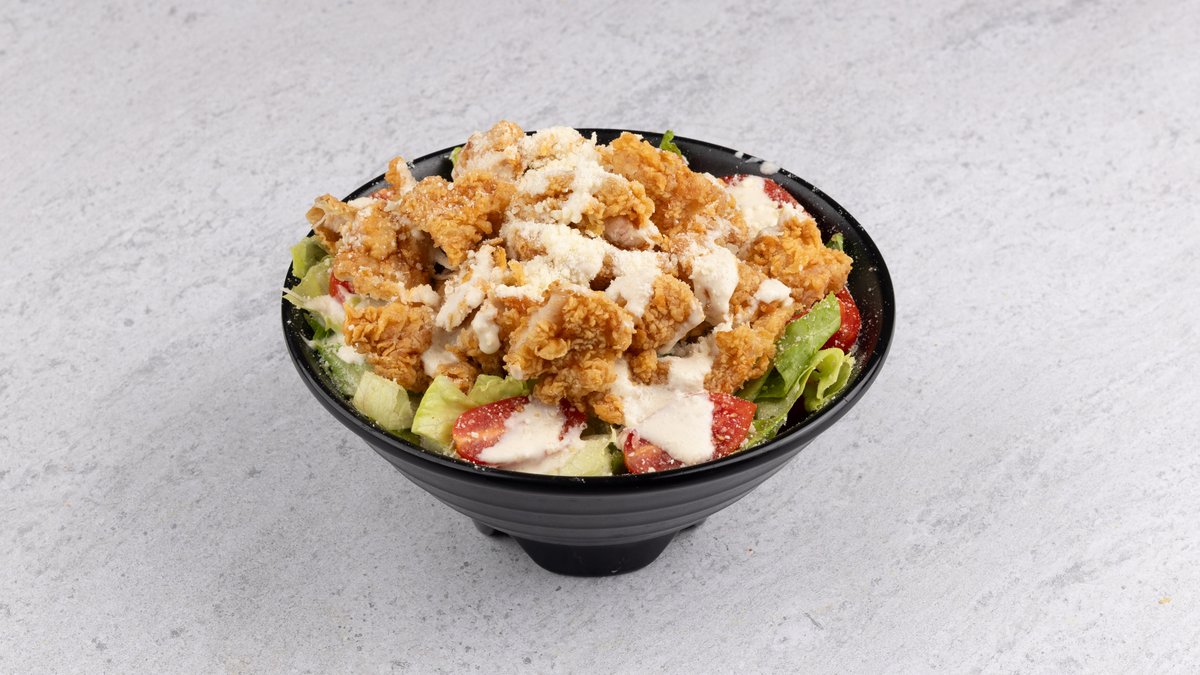 עוף קריספי, עגבניות שרי, חסה, בצל, קרוטונים ופרמז׳ן
