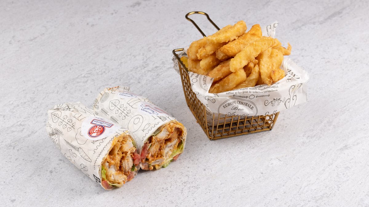 מוגש עם ברוסט צ'יפס, קולסלאו, רטבים, לחם ושתייה גדולה לבחירה
