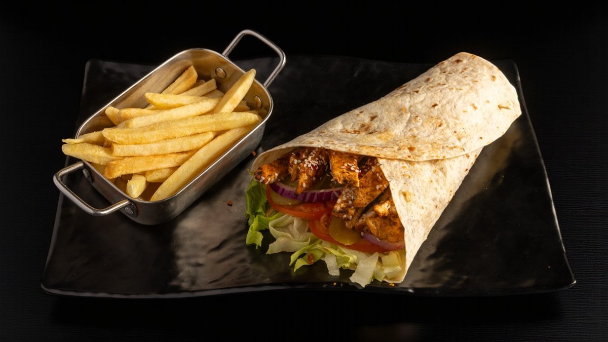 חזה עוף עם עגבניה, חסה, מלפפון חמוץ ובצל סגול בטורטיה מוגש עם צ'יפס