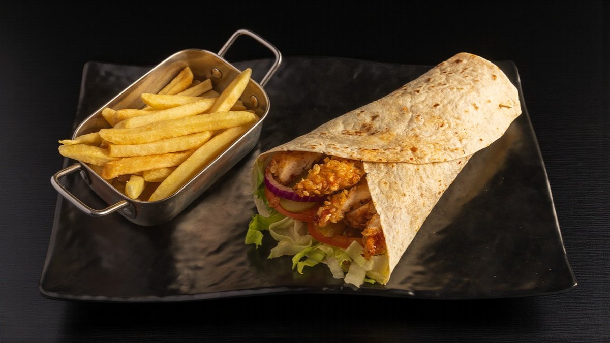 קריספי צ׳יקן עם עגבניה, חסה, מלפפון חמוץ ובצל סגול בטורטיה מוגש עם צ'יפס