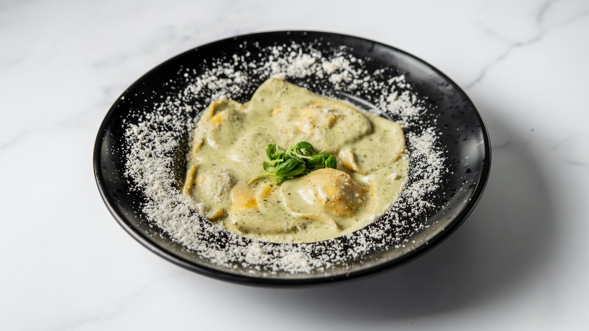 רביולי במילוי 4 סוגי גבינות ברוטב אלפרדו ופסטו