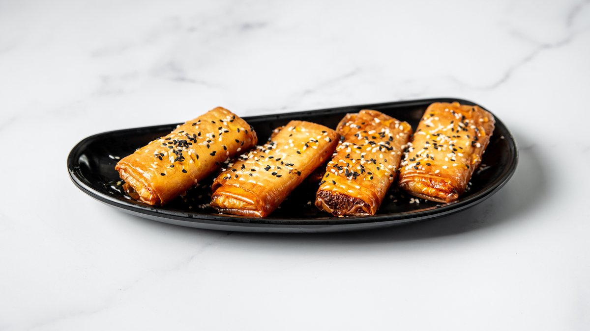 מאפה יווני מבצק פילו במילוי גבינת פטאקי, דבש ושומשום שחור לבן
