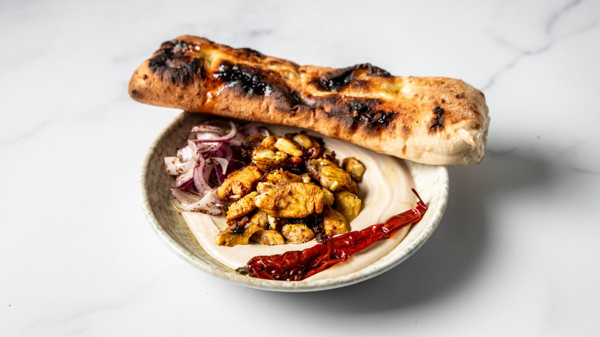 מוגש עם טחינה הר ברכה, בצל סומק, פלפל חריף מטוגן ולחם הבית