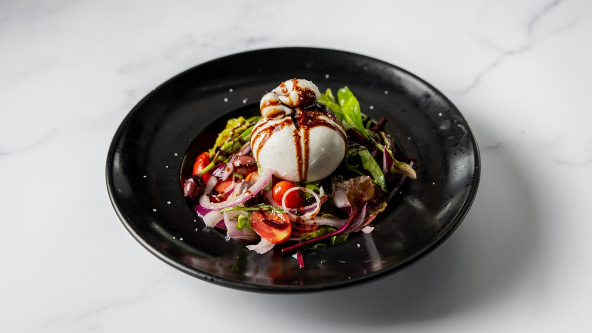 חסה לאליק, עגבניות שרי, בצל סגול, מלפפון, פלפל בצבעים, זיתי קלמטה, צנוניות וקרוטונים ברוטב ויניגרט