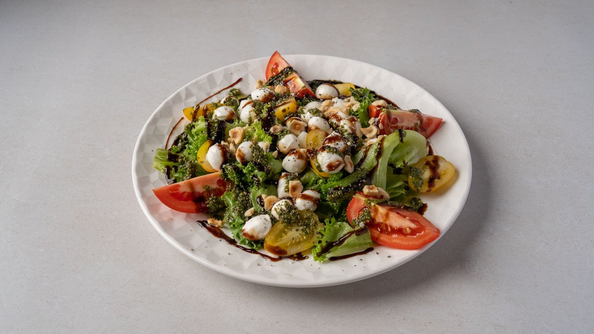 עגבנייה, מוצרלה בייב, רוקט, פסטו, אגוזי לוז וקרם בלסמי