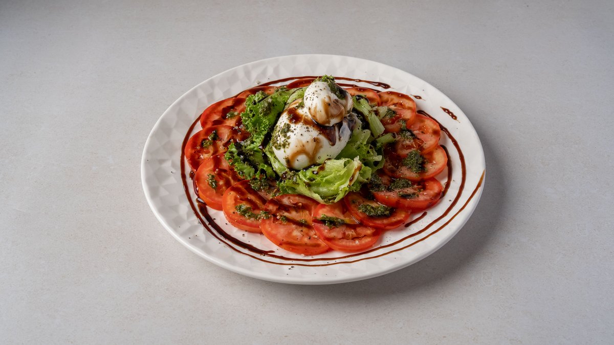 קרפצ'יו עגבניות עם בוראטה, פסטו, רוקט וקרם בלסמי