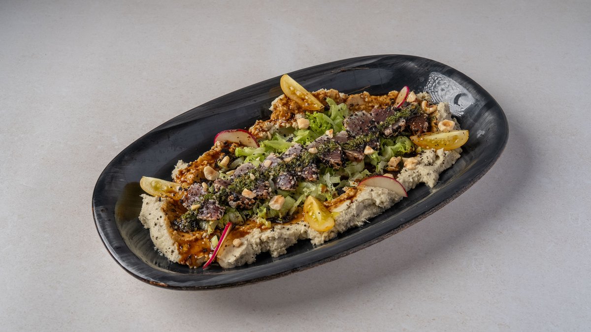 טונה בציפוי שומשום חצי מבושלת עם קרם ארטישוק, רוקט, אגוז לוז, רוטב פונזו (הדרים וסויה), אבקת הדרים וזיתים שחורים