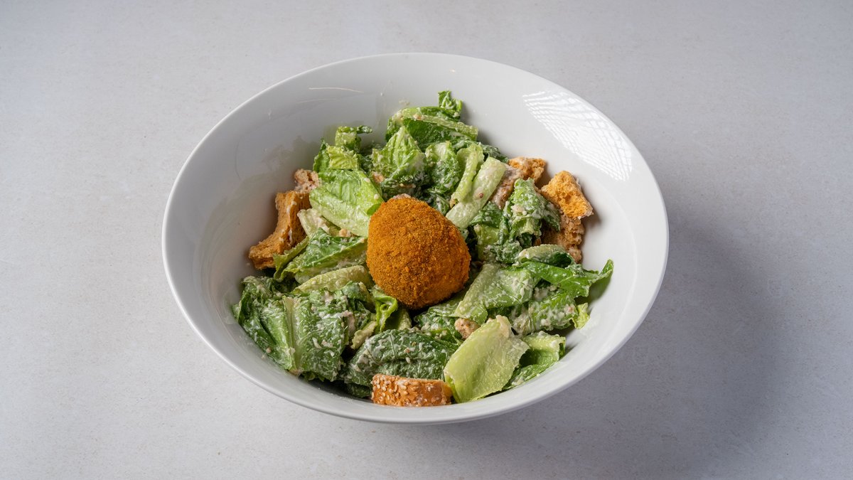 עלי קיסר עם עגבניות שרי, קרוטונים, ביצה, רוטב קיסר ופרמזן