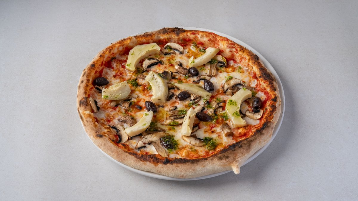 רוטב עגבניות, מוצרלה, ארטישוק, פטריות, זיתים