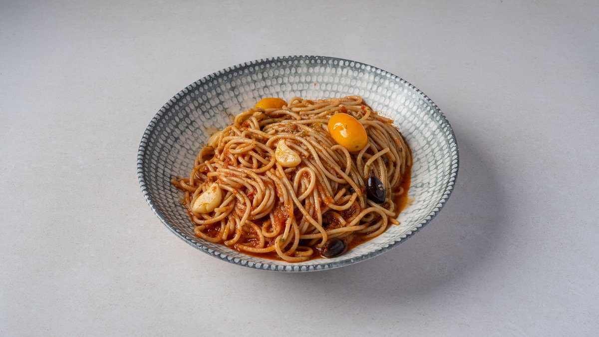עגבניות שרי, זיתי קלמטה, שום כבוש, בזיליקום, שמן זית, לימון