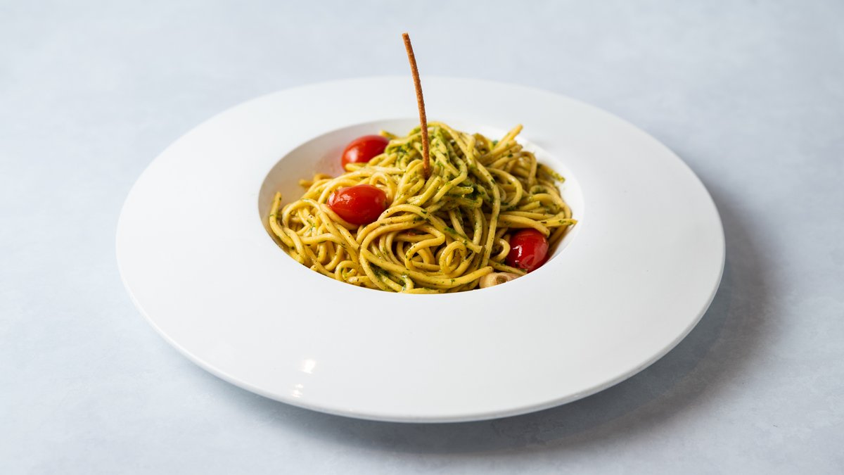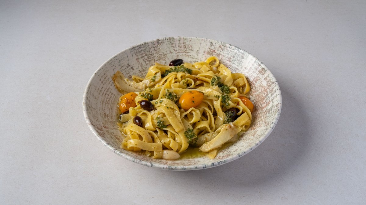 סטרצ'טלה עם שמן זית, פסטו, עגבניות מיובשות, רוקט, אגוז לוז, אבקת הדרים עם זיתים שחורים ופסטו
