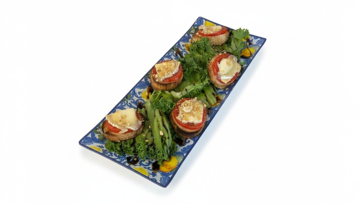 טוסטים עיזים עם עגבנייה, דבש ואגוזים על סלט ירוק ברוטב בלסמי