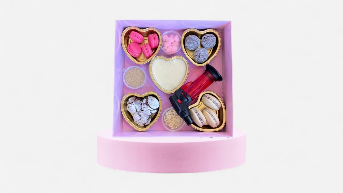 המארז כולל: 4 מיני קרם ברולה (50 מל) מיני ברנר רב שימושי עוגת קראנץ לבחירה 3 אלפחורס במילוי ריבת חלב 3 כדורי שוקולד עם סוכריות 4 מיני מקרונים במילוי קרם ברולה