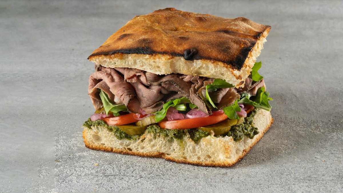 פניני איטלקי עם רוסטביף, סלסה ורדה, רוקט, עגבנייה, מלפפון חמוץ ובצל סגול כבוש