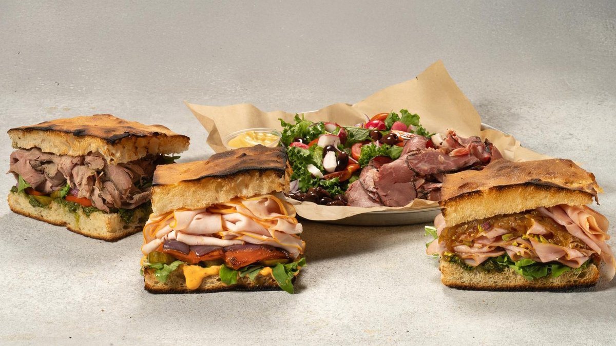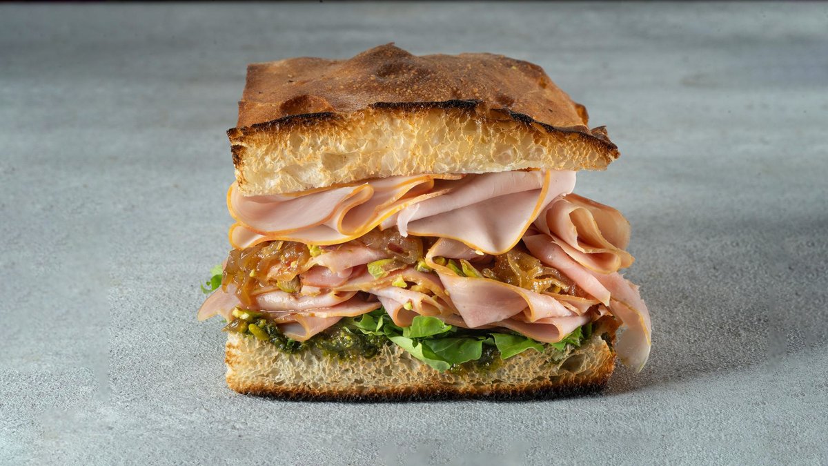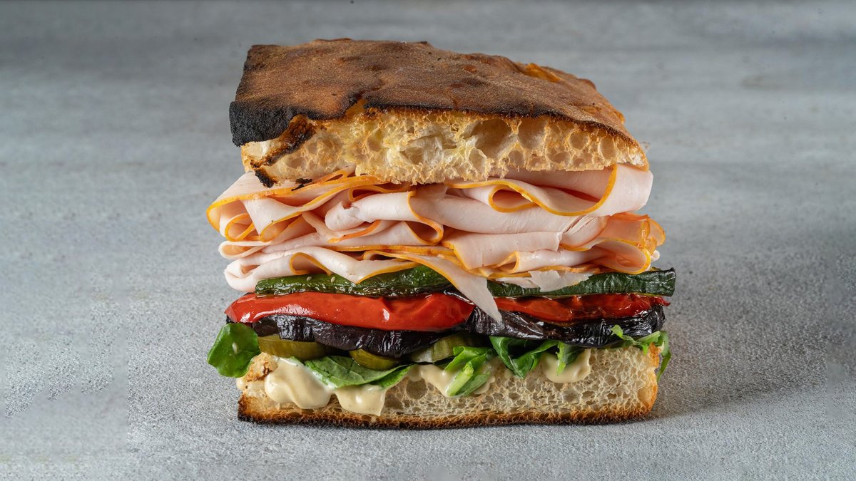פניני איטלקי עם פסטרמה הודו מעושן, איולי חרדל, רוקט, מלפפון חמוץ, ירקות צלויים בטאבון (זוקיני, גמבה וחציל)